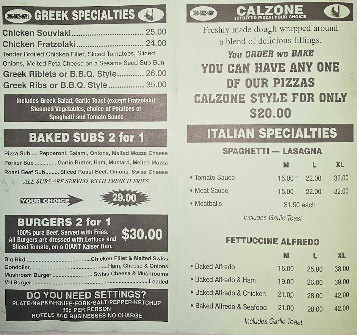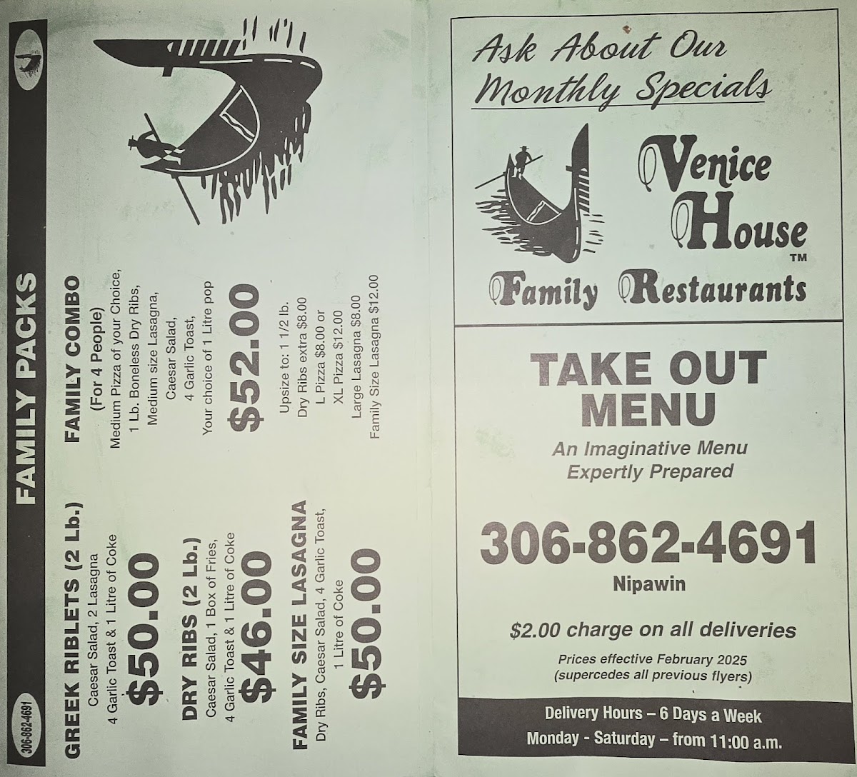Welcome to Nipawin Venice House, a hidden gem located at 118 1 Ave E, Nipawin, SK. This charming Greek restaurant offers a delightful menu that deserves your attention. Begin your culinary journey with their Soup of the Day or the ever-popular French Onion Soup, paired with decadent garlic and cheese toasts. The highlighting specialties include Greek dishes like Chicken Souvlaki and succulent ribs; customers rave about the flavors and tenderness of the steaks, which have been described as some of the best in western Canada.
